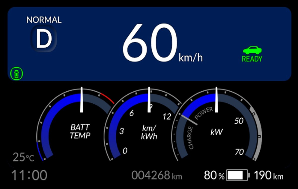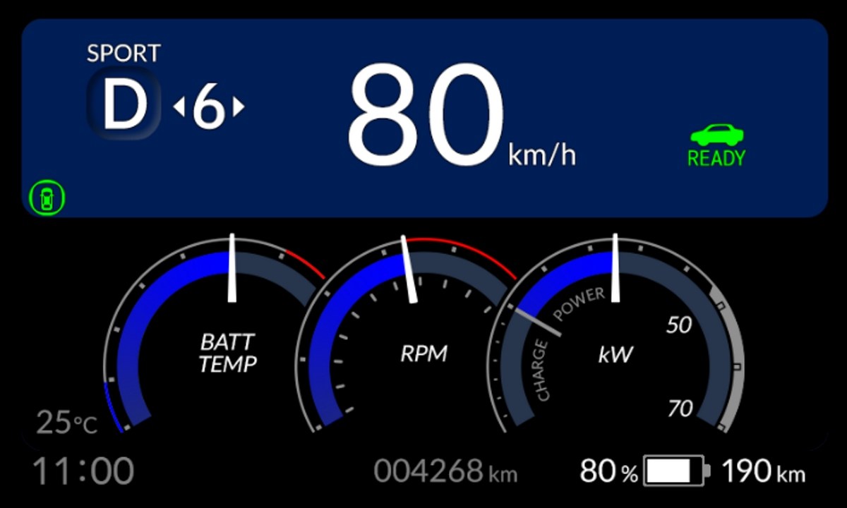 Кроме того, при активации "Режим ускорения" приборная панель и подсветка салона переключаются на специальную визуальную тему. Цифровая "тройная приборная панель", состоящая из "индикатора температуры батареи", "виртуального тахометра" и "измерителя мощности", выполнена в стиле, напоминающем классические механические аналоговые приборы.